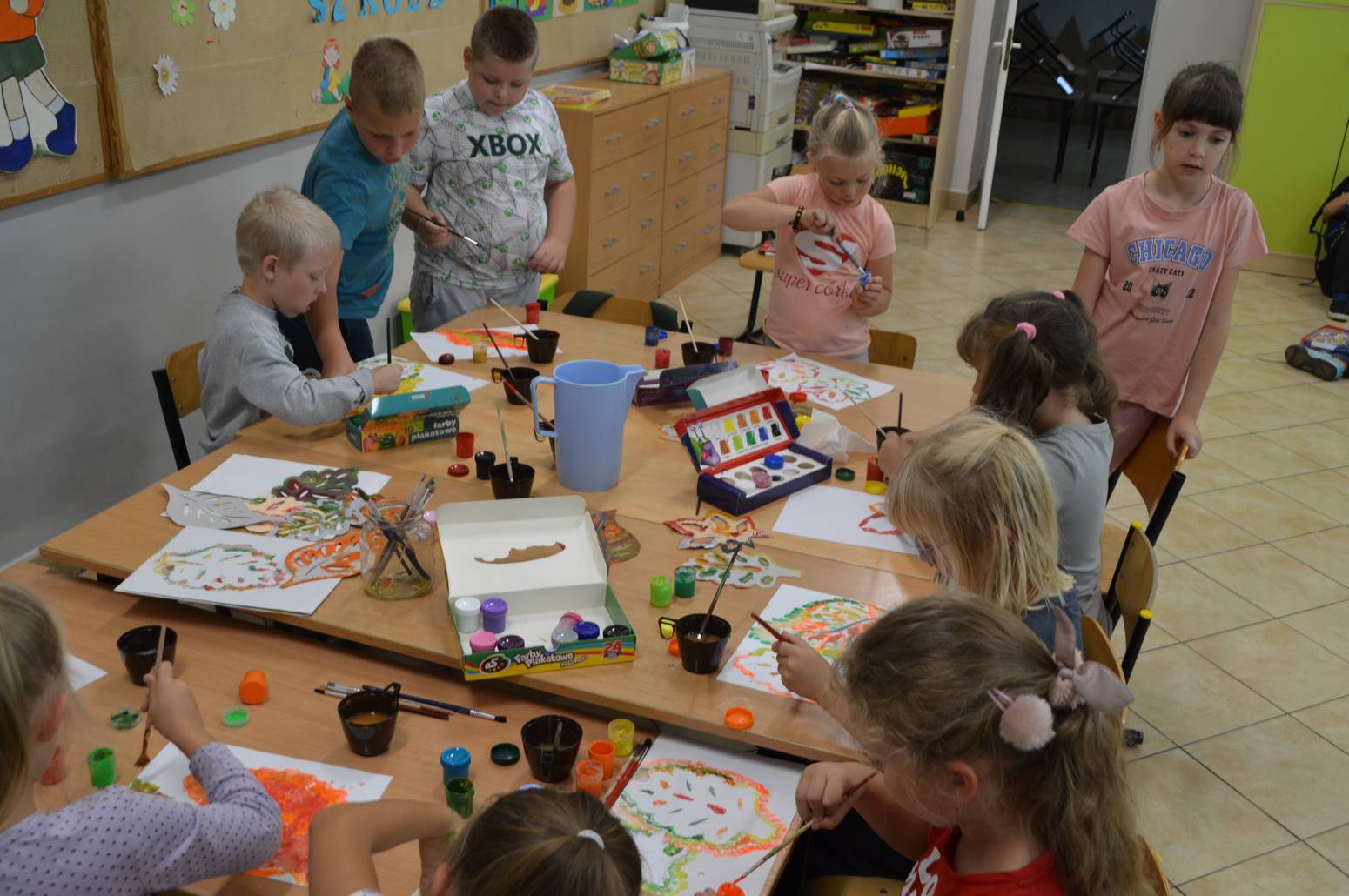 Reaktywacja zajęć kreatywno-świetlicowych jest faktem. Dzieci ze Szkoły Podstawowej w Wysokiem pod okiem animatorki z Gminnego Ośrodka Kultury Gminy Zamość, Ewy Miąsik, malowały liście jesieni na cyklicznych zajęciach kreatywno-świetlicowych w nowym sezonie Roku Szkolnego 2023-2024. Najpierw, na kartonach odrysowano kształty liści, wykorzystując tekturowe szablony, a następnie kolorowano liście farbami, używając nie tylko pędzelków, ale i …palców rąk. Tym sposobem powstało wiele ciekawych prac z kolorami Jesieni. Zabawa z farbami w takiej formie bardzo przypadła dzieciom do gustu. Oczywiście, po zajęciach trzeba było nieco dłużej myć ręce, ale kreatywna zabawa była przednia.