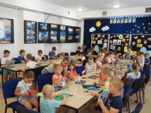 Dzień w GOK-u podzielono na 2 części. Pierwszą poświęcono rozwijaniu kreatywności podczas zajęć plastycznych z użyciem techniki diamond painting, czyli zdobienie plastikowymi samoprzylepnymi kryształkami (dżetami z „diamencikami”). Dzieciaki przy użyciu błyszczących i kolorowych kryształków oklejały szablony, które wcześniej przygotowały animatorki z GOK-u. W ten sposób powstały piękne, skrzące się blaskiem, wyjątkowe motyle, piłki, ptaki i bohaterowie z bajek. Każdy mógł zabrać swoją samodzielnie wykonaną pracę do domu i pochwalić się nią wśród swoich bliskich. Druga część to zajęcia plastyczno-praktyczno-edukacyjne pod hasłem „Mega But”, które z pewnością przydadzą się każdemu dziecku w codziennym życiu, zwłaszcza najmłodszym. Mowa tutaj o zabawie ze sznurówkami i węzłami, czyli wesołej i kreatywnej nauce wiązania butów na różne sposoby. Z obserwacji wynika, że sporo dzieci ma kłopot z tak podstawową czynnością, jak wiązanie butów. Wakacje w GOK-u cieszą się z roku na rok coraz większym powodzeniem i zainteresowaniem – w miniony wtorek w zajęciach wzięło udział aż 35 młodych uczestników. Co najważniejsze, podoba im się wspólne spędzanie czasu wg oferty Zamojskiego „GOK-u Wysokie”. Entuzjazm i uśmiech nie opuszczały ich twarzy, a dla nas, animatorów kultury, to najcenniejsza nagroda i zarazem ogromny sukces. Dziękujemy za wspólnie spędzony czas w pozytywnej i kreatywnej atmosferze.