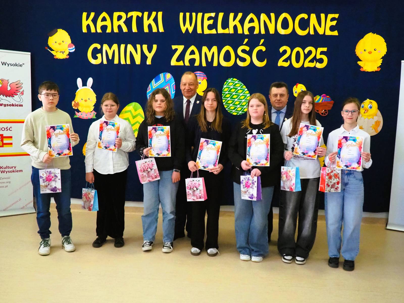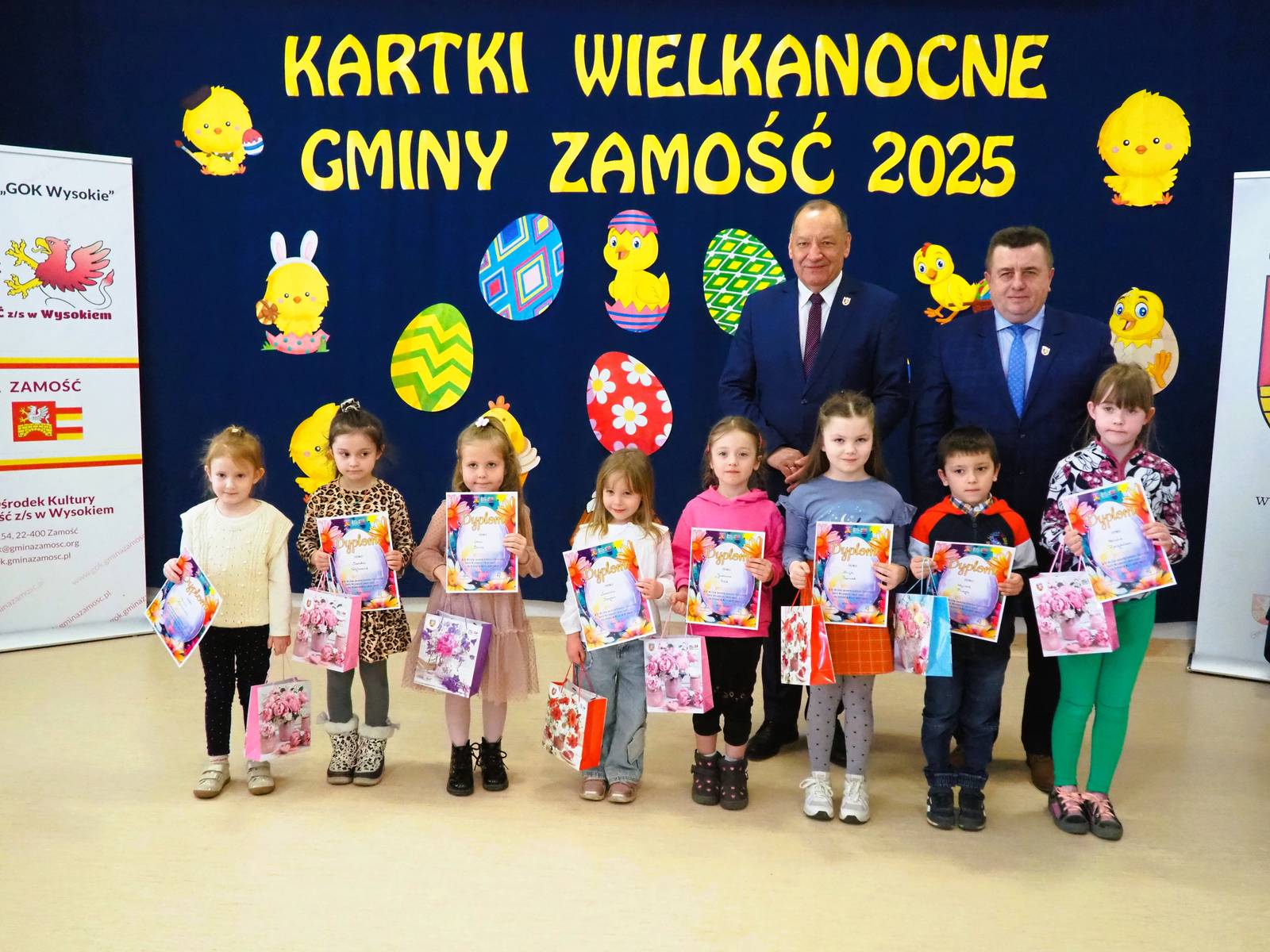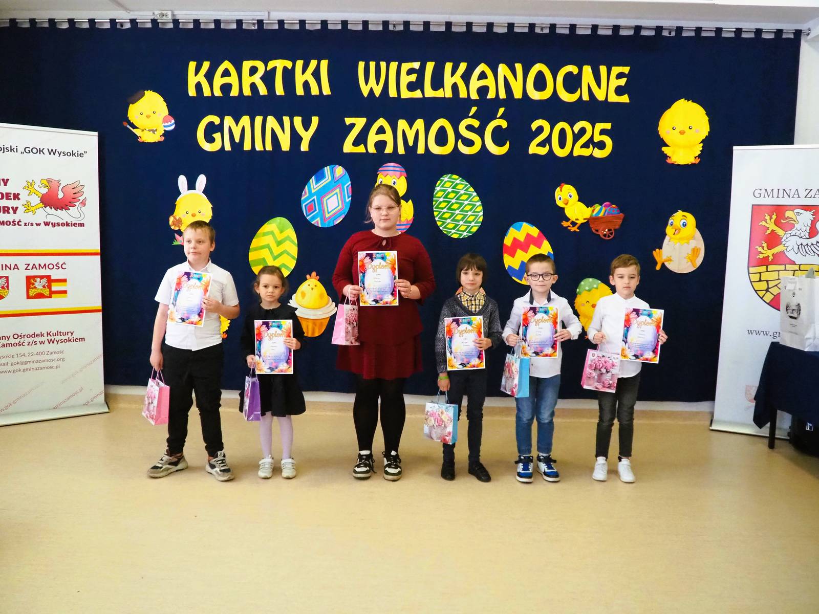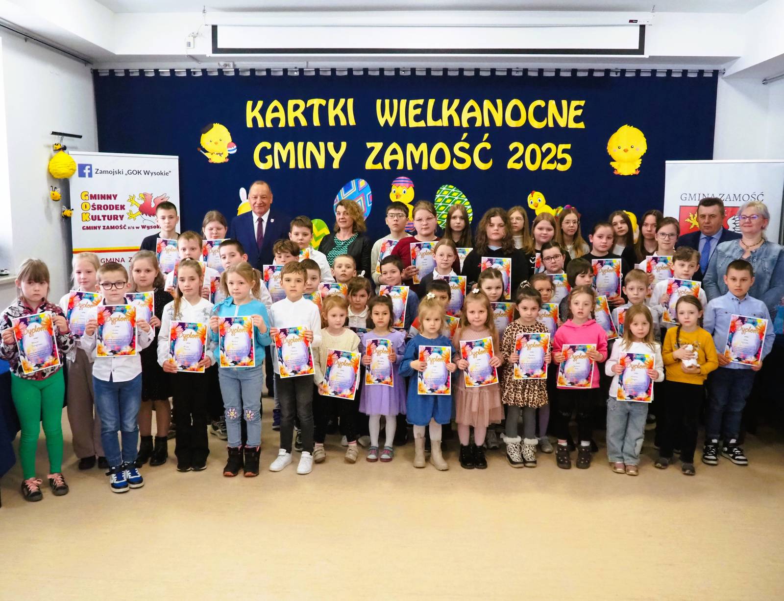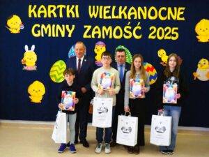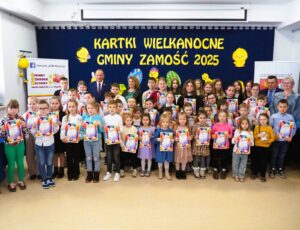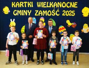 Aż 513 prac wpłynęło na XXI Wielki Gminny Konkurs Plastyczny „Kartki Wielkanocne Gminy Zamość 2025” pod patronatem Wójta Ryszarda Gliwińskiego. Od 10 lat konkurs organizuje Gminny Ośrodek Kultury Gminy Zamość w Wysokiem. Jury wyróżniło 70 prac i wybrało tzw. „Wielką Piątkę”, czyli 5 równorzędnych głównych prac (zobacz poniżej gotowe projekty gminnych pocztówek na Wielkanoc). Ogłoszenie wyników i wręczenie nagród odbyło się w czwartek, 10.04.2025 r., na uroczystym spotkaniu finałowym w siedzibie GOK-u (poniżej foto-relacja). Dyplomy i nagrody wręczali Wójt Ryszard Gliwiński oraz Przewodniczący Rady Gminy Zamość Piotr Koczułap.