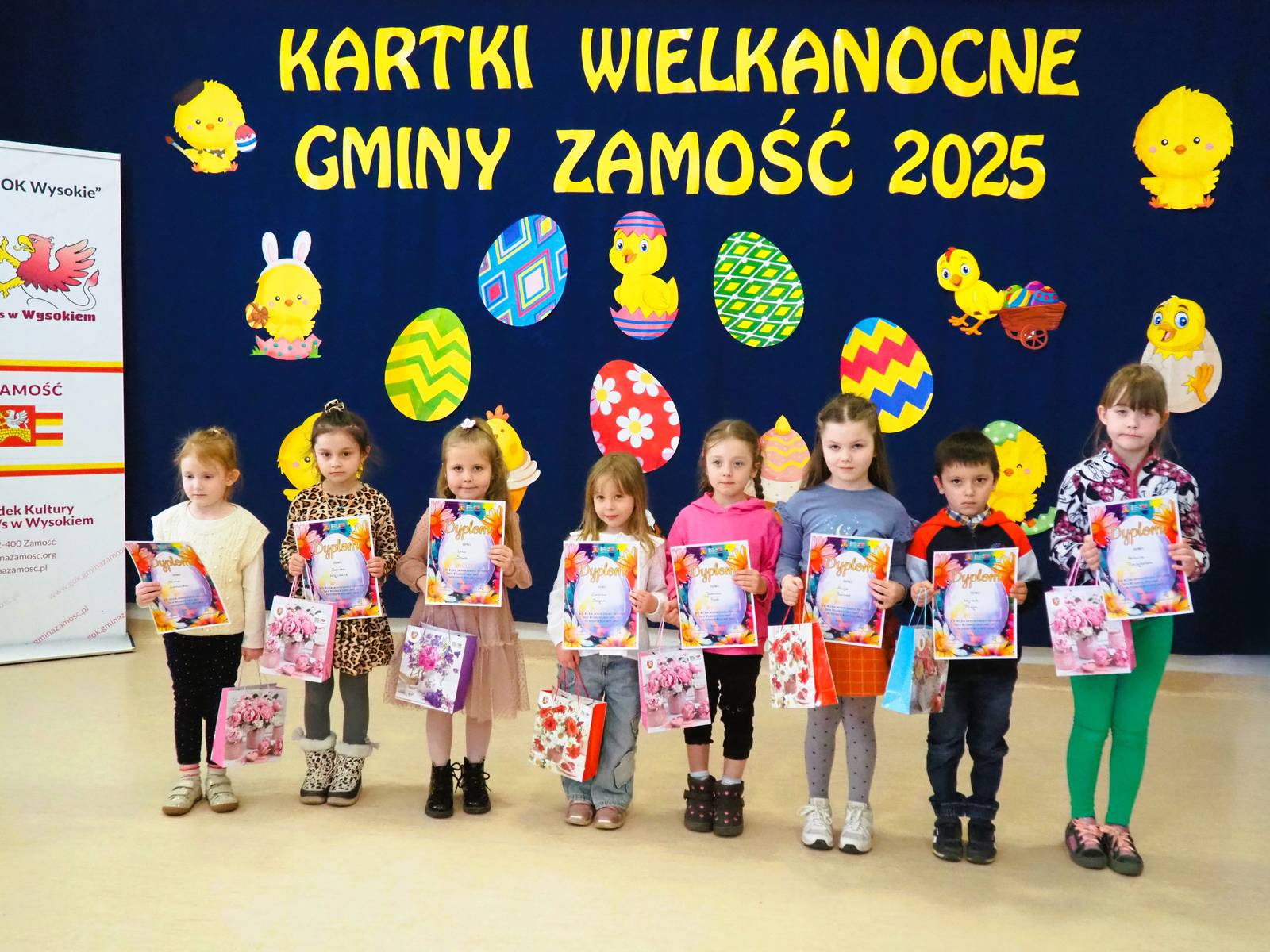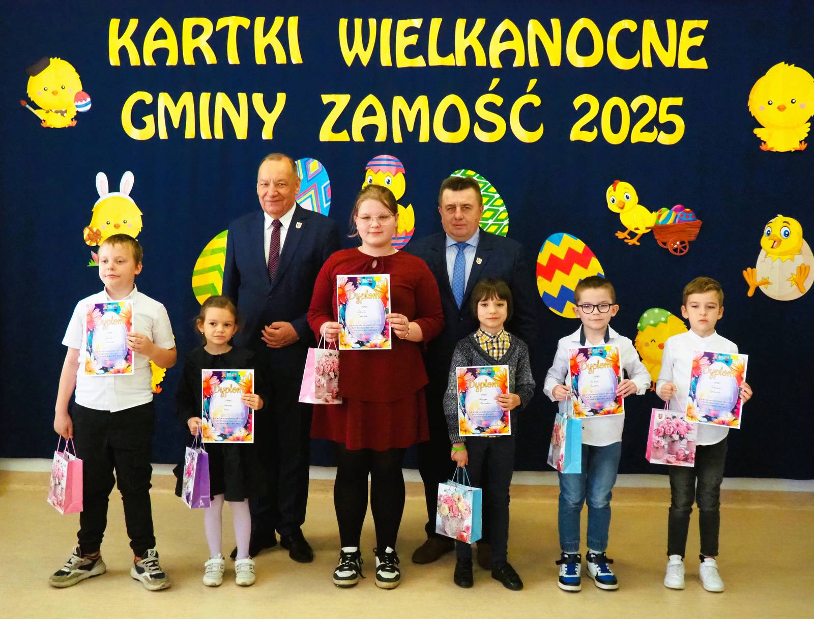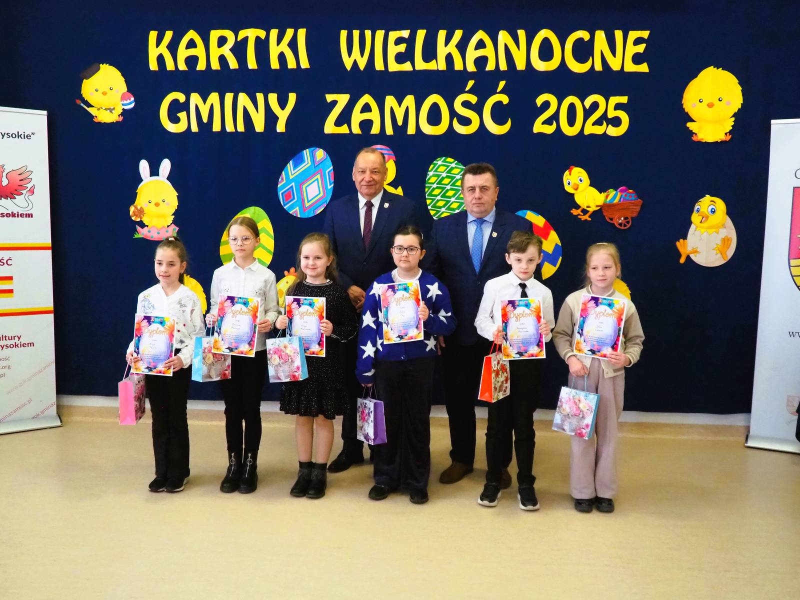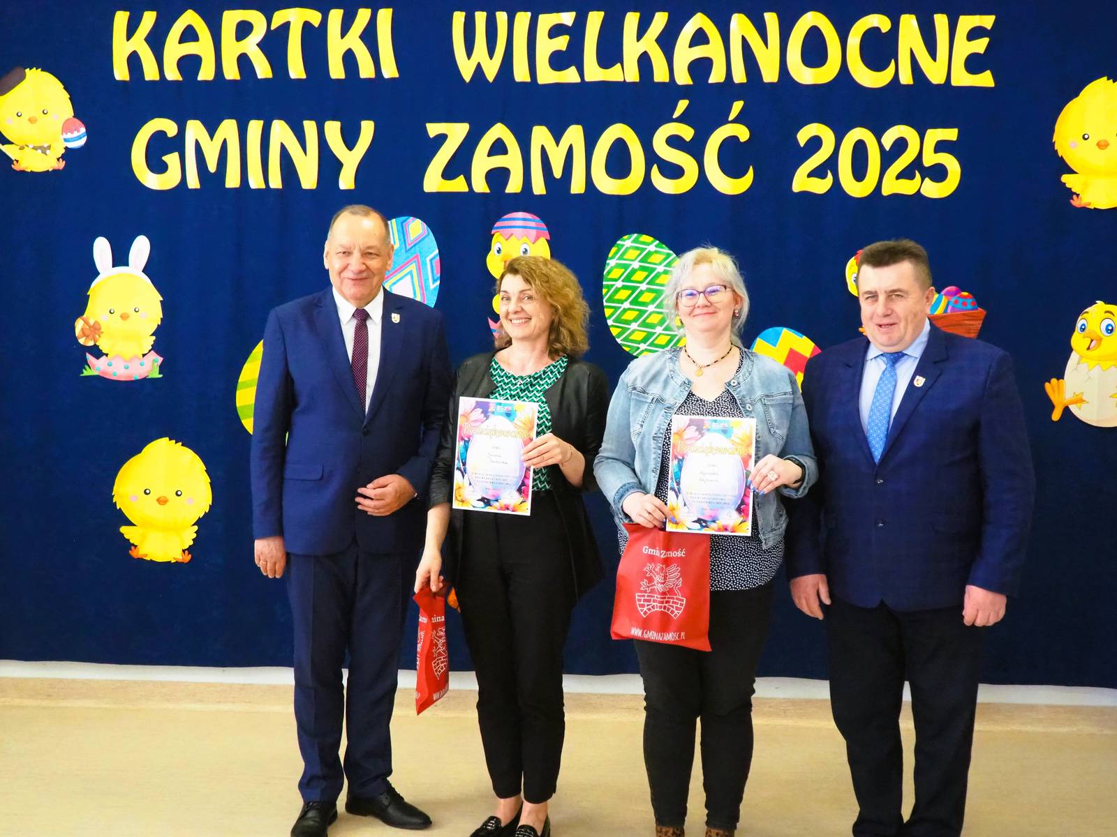 Aż 513 prac wpłynęło na XXI Wielki Gminny Konkurs Plastyczny „Kartki Wielkanocne Gminy Zamość 2025” pod patronatem Wójta Ryszarda Gliwińskiego. Od 10 lat konkurs organizuje Gminny Ośrodek Kultury Gminy Zamość w Wysokiem. Jury wyróżniło 70 prac i wybrało tzw. „Wielką Piątkę”, czyli 5 równorzędnych głównych prac (zobacz poniżej gotowe projekty gminnych pocztówek na Wielkanoc). Ogłoszenie wyników i wręczenie nagród odbyło się w czwartek, 10.04.2025 r., na uroczystym spotkaniu finałowym w siedzibie GOK-u (poniżej foto-relacja). Dyplomy i nagrody wręczali Wójt Ryszard Gliwiński oraz Przewodniczący Rady Gminy Zamość Piotr Koczułap.