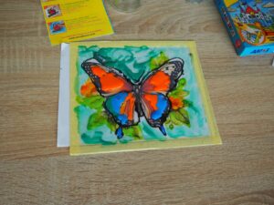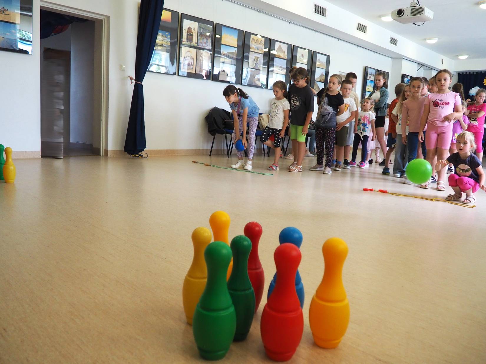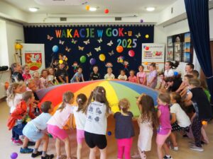 Program zajęć był różnorodny i dostosowany do potrzeb młodych uczestników. Jednym z głównych punktów były warsztaty kreatywno-manualne, podczas których dzieci miały okazję spróbować swoich sił w malarstwie na szkle, przy czym ciężkie i kruche szkło zostało zastąpione przez sztywną folię bez uszczerbku na jakości twórczości. Technika malowania na szkle (folii lub plexi), choć wymagająca precyzji, okazała się świetną zabawą. Powstały kolorowe i pełne wyobraźni prace, które dzieci z dumą zabrały do domów. Nie zabrakło także zabaw ruchowych, w tym rywalizacji i sportowych emocji podczas zabaw sprawnościowych. Tor przeszkód, zabawy ruchowe i wyścigi drużynowe dostarczyły uczestnikom mnóstwo radości, a jednocześnie były świetnym sposobem na rozładowanie energii. Dzieci miały również okazję spróbować swoich sił w grze w kręgle, która okazała się strzałem w dziesiątkę i wzbudziła wiele pozytywnych emocji. Równie dużym zainteresowaniem cieszyły się gry i zabawy z chustą animacyjną, które integrowały grupę i wywoływały wiele uśmiechu. Zabawy z chustą to doskonały sposób na rozwijanie koordynacji ruchowej, współpracy oraz kreatywnego myślenia – ile radości przyniosła ta zabawa pokazuje ostatnie zdjęcie naszej foto-galerii – polecamy. Letnie zajęcia w GOK-u są nie tylko okazją do zabicia wakacyjnej nudy, ale przede wszystkim do interakcji z innymi dziećmi, rozwijania pasji, odkrywania w sobie nowych talentów, uspołeczniania młodego człowieka poprzez współdziałanie i nawiązywanie nowych znajomości, a także spędzania czasu w twórczej i przyjaznej atmosferze. Dziękujemy wszystkim dzieciom za aktywny udział i zapraszamy na kolejne wakacyjne spotkania!
