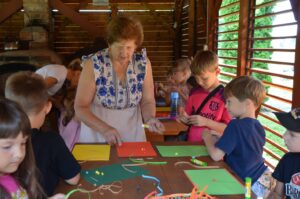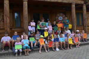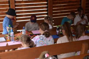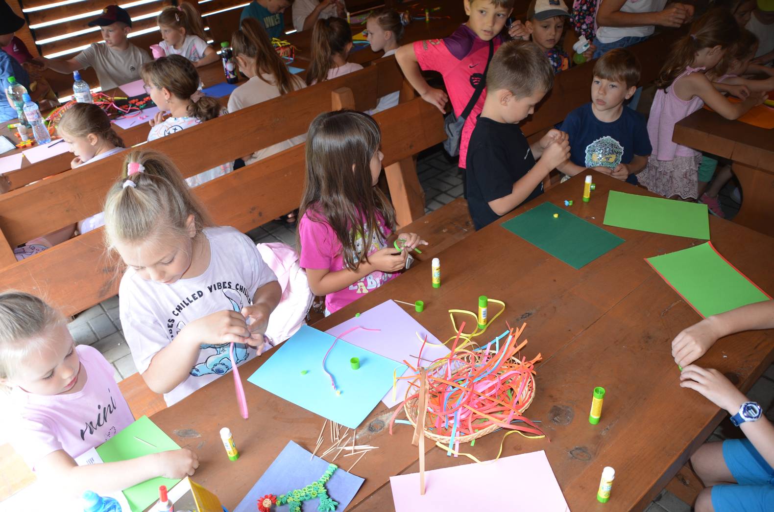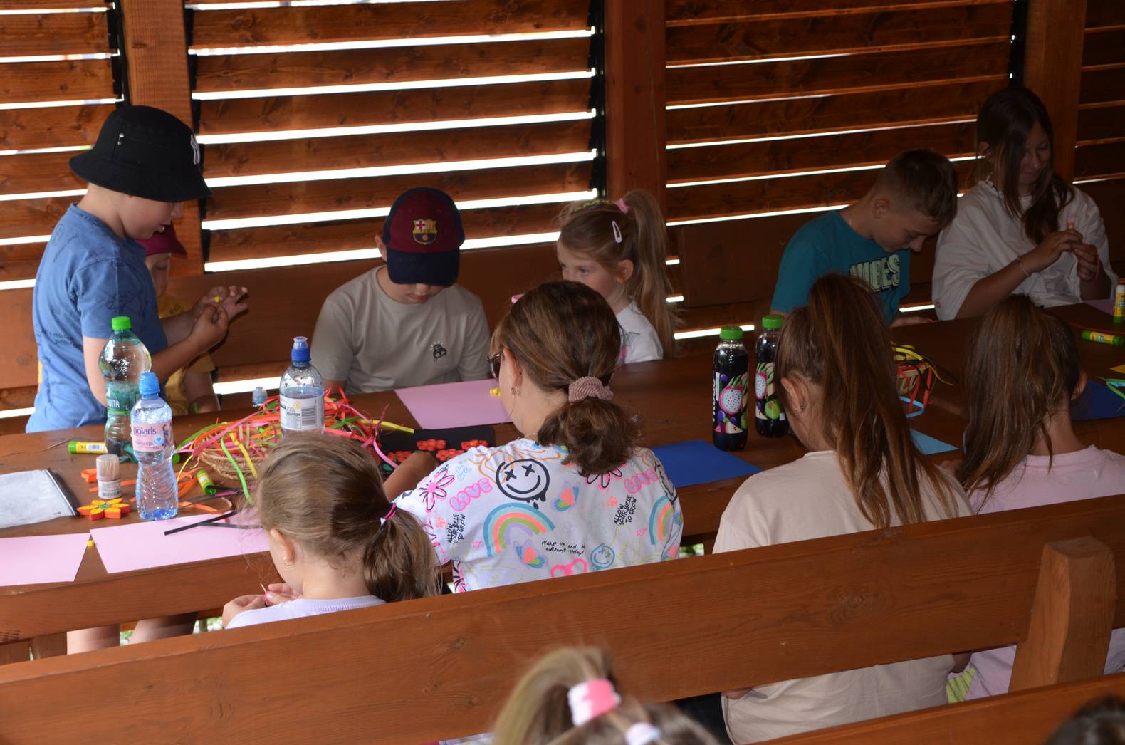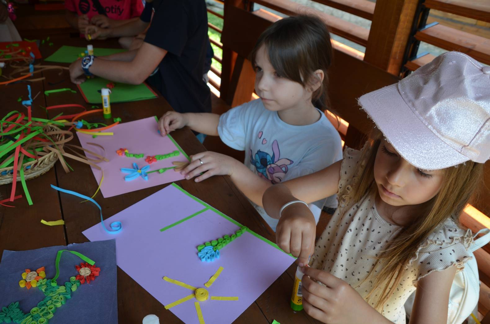 W pierwszy czwartek sierpnia, 07.08.2025 r., uczestnicy kolejnych letnich zajęć z cyklu „Wakacje w GOK-u i Izbie” zastali altankę przy Regionalnej Izbie Pamięci w Wysokiem wypełnioną koszykami z kolorowanymi paseczkami z papieru. Były to przygotowane wcześniej materiały plastyczne do warsztatów z Quillingu.