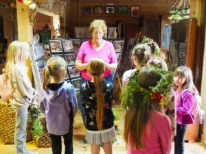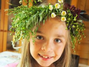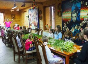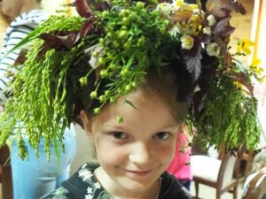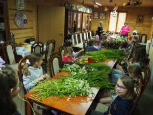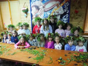 Dzieci wiły wianki w wysockiej Izbie, poznając jednocześnie długą i bogatą historię tej umiejętności, wplecionej w tradycyjne zwyczaje ludowe. Wianuszki znane były już w starożytności i były wykorzystywane w wielu kulturach i przy okazji różnych obrzędów jako symbole związane z naturą. Współcześnie są przede wszystkim lubianym elementem dekoracyjnym i zanikającą umiejętnością. Ze sztuką tworzenia wianków mogły zapoznać się dzieci, które wzięły udział w warsztatach zorganizowanych przez Gminny Ośrodek Kultury Gminy Zamość z/s w Wysokiem wraz z Opiekunką Regionalnej Izby Pamięci w Wysokiem. Pod okiem naszych Pań instruktorek mali twórcy za pomocą sznurka i nici oraz świeżych krzewów, pachnących ziół i kolorowych kwiatów, zebranych przez Opiekunkę Izby, Panią Wandę Szpugę, uczyli się wić piękne wianki. Powstały wyjątkowe, cudne i kolorowe dzieła, które przyozdobiły głowy uczestników zajęć. Na finał spotkania odbył się konkurs z zagadkami „zgaduj-zgadula” na temat obiektów Izby i zgromadzonych tam eksponatów. Łącznie w warsztatach udział wzięło 24 dzieci. Był to czas wspólnego twórczego działania w przyjemnej atmosferze i niecodziennej formie spędzania czasu z dala od zabieganego życia codziennego.