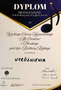 W podkarpackim przeglądzie obowiązkowym repertuarem było wykonanie minimum 3 utworów o tematyce pasyjnej, natomiast czas trwania nie mógł przekroczyć 20 minut. Zespół „Ale Cantare” pod dyrekcją Barbary Rabiegi wykonał aż 5 utworów: „Stabat Mater”, „In Monte Oliveti”, „Parce Domine”, „Ubi Caritas” i „Ecce Homo”. Tegoroczne jury tworzyli uznani specjaliści w dziedzinie muzyki: Elżbieta Krzemińska, Mariusz Kramarz oraz Damian Mączarski. Choć zespół „Ale Cantare” z Płoskiego nie stanął na podium, zdobyte wyróżnienie przy tak wysokim poziomie artystycznym uczestników stanowi duże osiągnięcie i powód do dumy. Pierwsze miejsca ex aequo przyznano chórowi „Veraicon” z Nowego Sącza oraz Strzyżowskiemu Chórowi Kameralnemu. Drugie miejsce zajął Męski Zespół Wokalny „Cantus Masculinum” z Krakowa. Trzeciego miejsca nie przyznano. Wyróżnienia, oprócz „Ale Cantare”, otrzymały formacje „Rosarium” z Wysokiej Głogowskiej i „Cantilena” z Radymna. Przegląd odbywał się pod patronatem honorowym Kamila Dziukiewicza Starosty Powiatu Jarosławskiego. Wielkie gratulacje dla śpiewających pań z „Ale Cantare”!