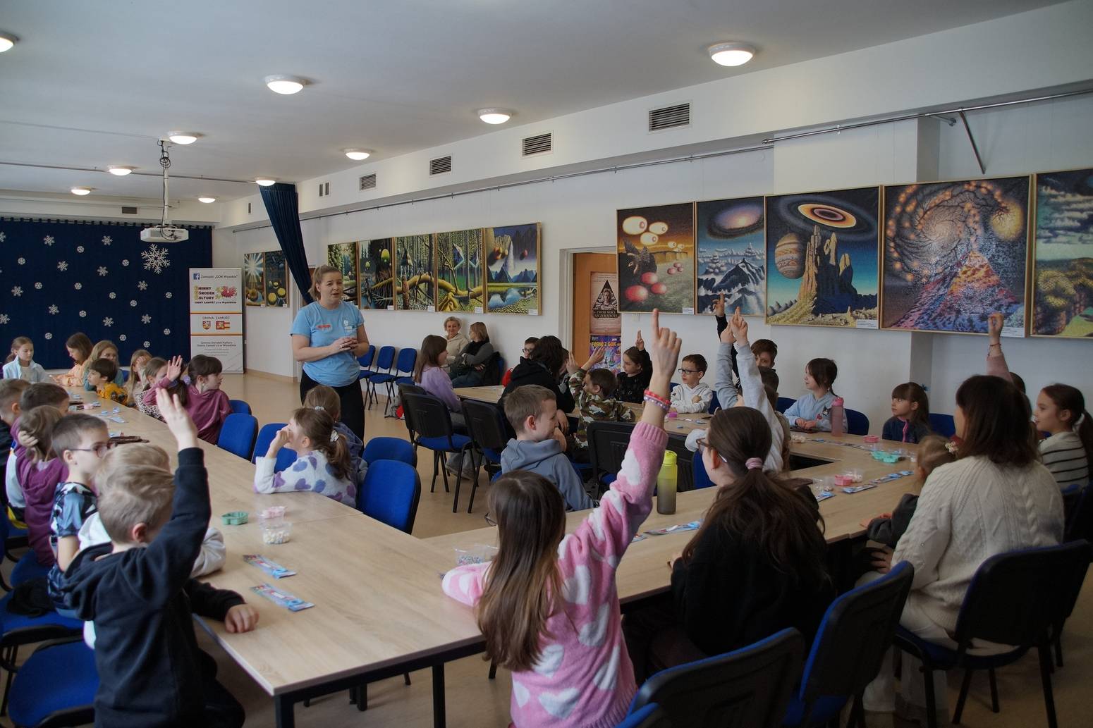 W środę, 25.02.2026 r., na uczestników czekała prawdziwa magiczna niespodzianka. Niemal 40-tka dzieci wzięło udział w spotkaniu z iluzjonistą Ireneuszem Łopuckim. Artysta oczarował małoletnią publiczność efektownymi trikami z liną, kartami do gry oraz ogromnymi kartami scenicznymi. W programie znalazł się również pokaz cyrkowy połączony z warsztatami i animacjami, dzięki czemu dzieci mogły nie tylko podziwiać występ, ale także aktywnie w nim uczestniczyć. 2 godziny minęły błyskawicznie w radosnej i twórczej atmosferze. Iluzja, żonglerka, magiczne chusteczki, „czary mary” i aktywność ruchowa pozwalały na długo zapomnieć o nudzie.
