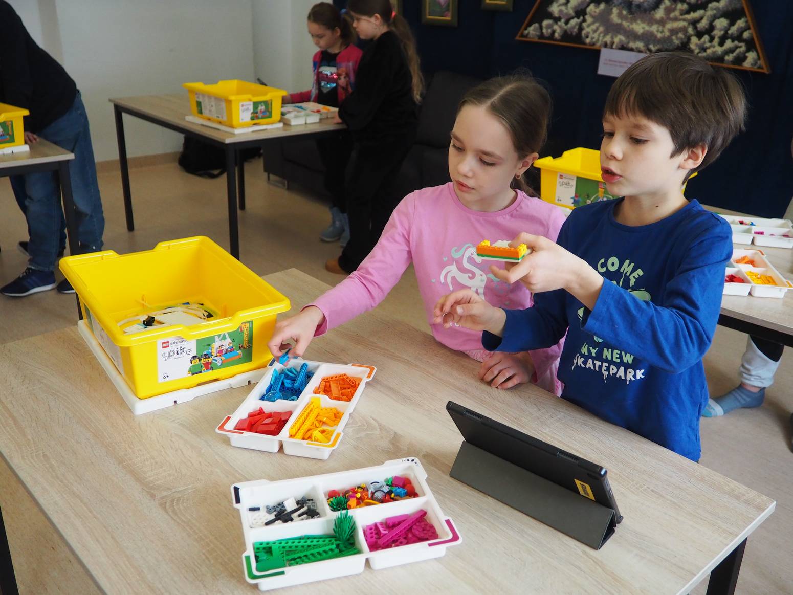 Na środę, 18.02.2026 r., zaplanowano kreatywno-manualne zajęcia konstrukcyjne z klockami LEGO, z wykorzystaniem podstaw programowanej robotyki. Zajęcia poprowadzili doświadczeni instruktorzy z „Edukido”. Dzieci pracowały w 2 grupach tematycznych, które po godzinie zamieniły się tematami. Jedna grupa skupiła się na robotyce i konstruowaniu i programowaniu własnych pojazdów z silniczkiem, czujnikami i światełkami, sterowanych za pomocą tabletu, a druga grupa z zapałem konstruowała pojazdy do specjalnego toru na pochylni zjazdowej. Zadania wymagały od dzieci nie tylko sprawności manualnej, ale też pobudzenia wyobraźni przestrzennej oraz logicznego myślenia i planowania kolejnych etapów pracy.