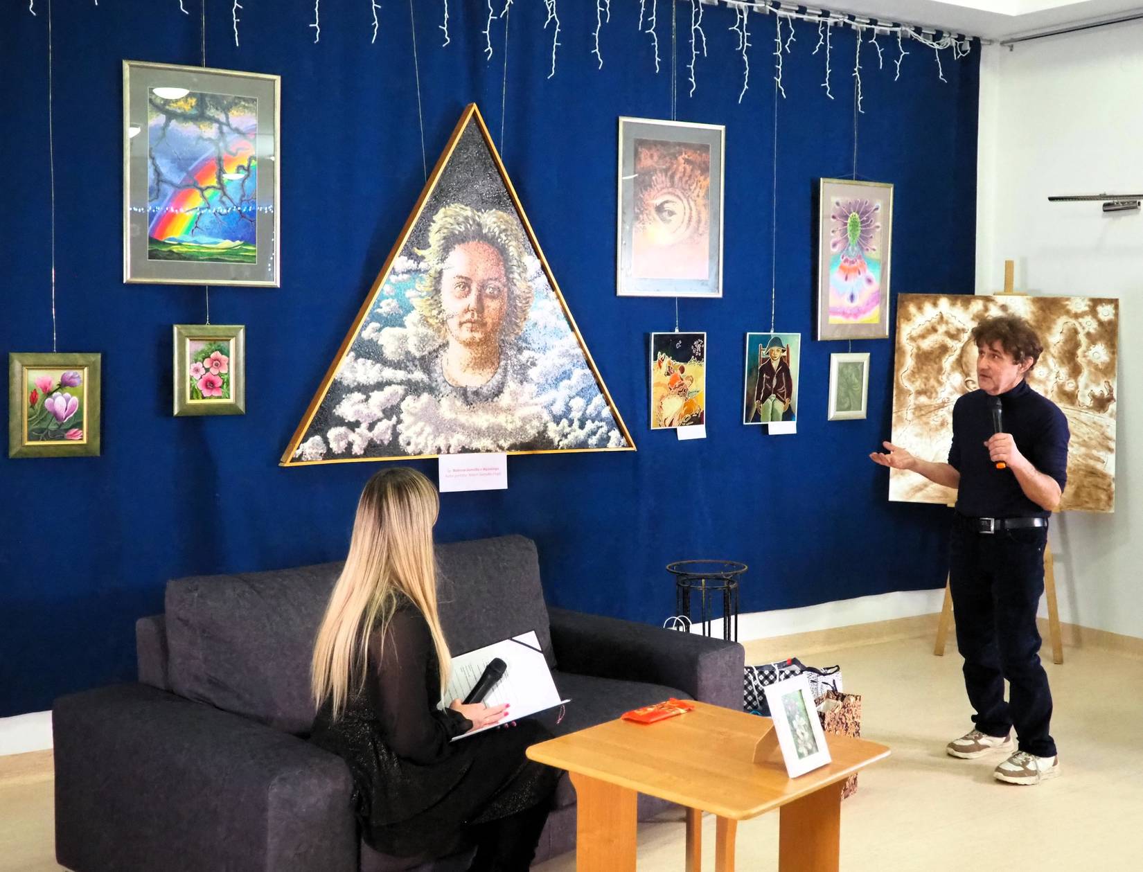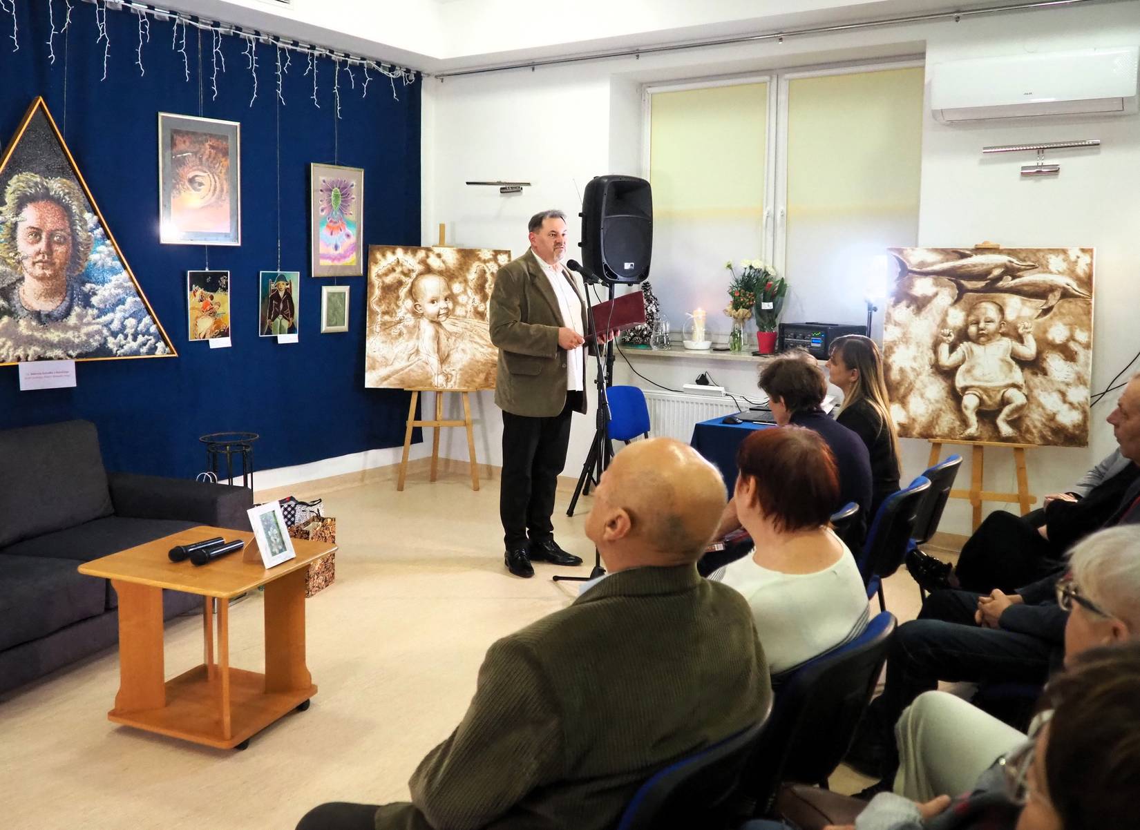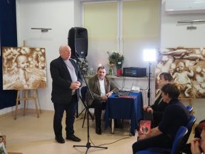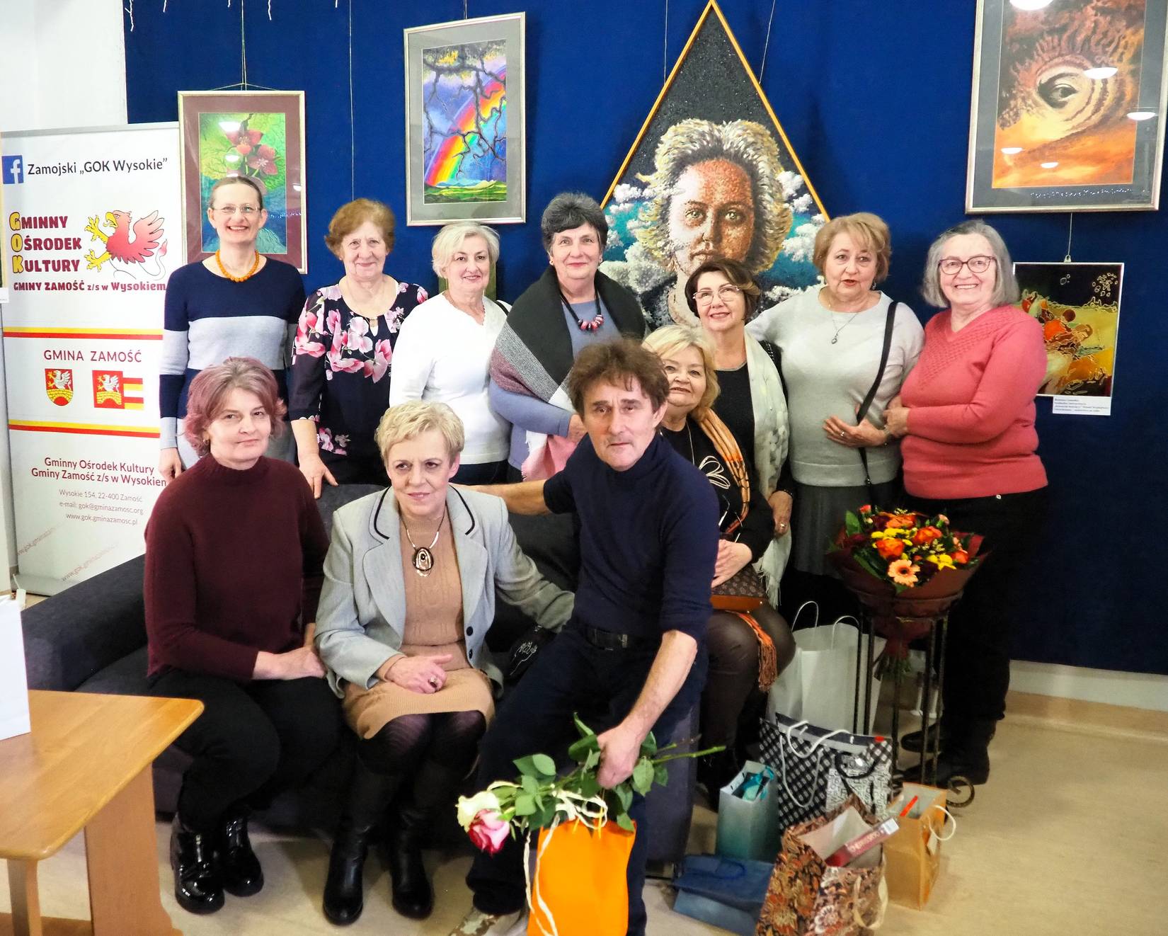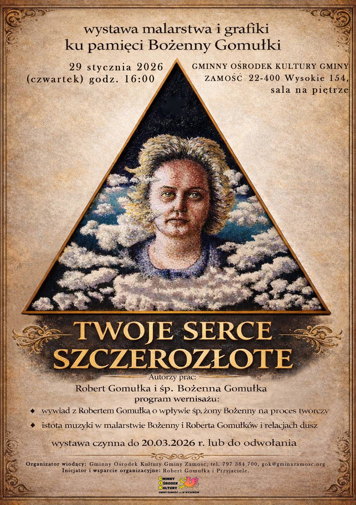 Wprawdzie inicjatorem przedsięwzięcia był Robert Gomułka, to jednak w organizację wystawy i wernisażu włączyli się przyjaciele i znajomi Państwa Gomułków, m.in. pracownicy BWA Galerii Zamojskiej i Gminnego Ośrodka Kultury Gminy Zamość. Wystawę malarstwa, grafiki i szkiców zatytułowano „Twoje serce szczerozłote”. Zaprezentowano na niej wybrane obrazy Pani Bożenny, wykonane różnymi technikami, ale przede wszystkim najnowszą twórczość Roberta Gomułki z ostatnich 2 lat, ponieważ Bożenna Gomułka przedkładała wspieranie artystycznych działań męża ponad własne potrzeby samorealizacji artystycznej. Robert Gomułka przyznał, że dobór dzieł na wystawę był świadomy, a w każdym jego obrazie, szkicu bądź grafice jest kawałek duszy Pani Bożenny, bo bez niej te dzieła by nie powstały. Wernisaż rozpoczął gospodarz obiektu, Jarosław Kalbarczyk, dyrektor Zamojskiego „GOK-u Wysokie”, potem kilka słów wspomnień wygłosili emerytowani pracownicy Szkoły Podstawowej im. Edwarda Kasprzysiaka w Wysokiem, Krzysztof Mróz i Ewa Surmacz, którzy przybliżyli osobę Pani Bożenny jako wieloletnią nauczycielkę plastyki w tej szkole. Do wspomnień o pracy pedagogiczno-artystycznej Bożenny Gomułki przyłączyła się również Dorota Nowosad, obecnie koordynatorka działań społeczno-kulturalnych Osiedlowego Domu Kultury „Okrąglak” w Zamościu. Ciekawym elementem wernisażu była następnie rozmowa publiczna o wyjątkowych relacjach duchowych, łączących dwie artystyczne dusze Bożenny i Roberta Gomułków. Rozmowa miała formę wywiadu na żywo. Moderatorką tej części spotkania była Ewelina Michalska, dziennikarka Katolickiego Radia Zamość i zarazem mieszkanka Wysokiego. Pan Robert opowiadał o wpływie żony na jego twórczość artystyczną, o wspólnych gustach muzycznych, o nieustannych wzajemnych dyskusjach na każdym etapie procesu twórczego. Pani Bożenna była wszak pierwszą recenzentką prac męża. To wszystko było dla Roberta Gomułki na tyle ważne, że jeśli uda mu się kontynuować tworzenie po stracie najbliższej osoby, to każdy obraz namaluje „dla niej, dla Bożenki”. Publiczność tego wyjątkowego wernisażu w dużej mierze składała się z osób reprezentujących środowiska artystów zamojskich, działaczy kultury, przyjaciół Bożenny i Roberta Gomułków oraz po prostu miłośników sztuki. Nie zabrakło również przedstawicieli samorządu gminnego z Wójtem na czele, przyjaciół, znajomych oraz mieszkańców Zamościa, Gminy Zamość, wsi Wysokie i okolic. Wystawa, pt. „Twoje serce szczerozłote” ku pamięci Bożenny Gomułki będzie czynna w Zamojskim „GOK-u Wysokie” co najmniej do 20.03.2026 r.