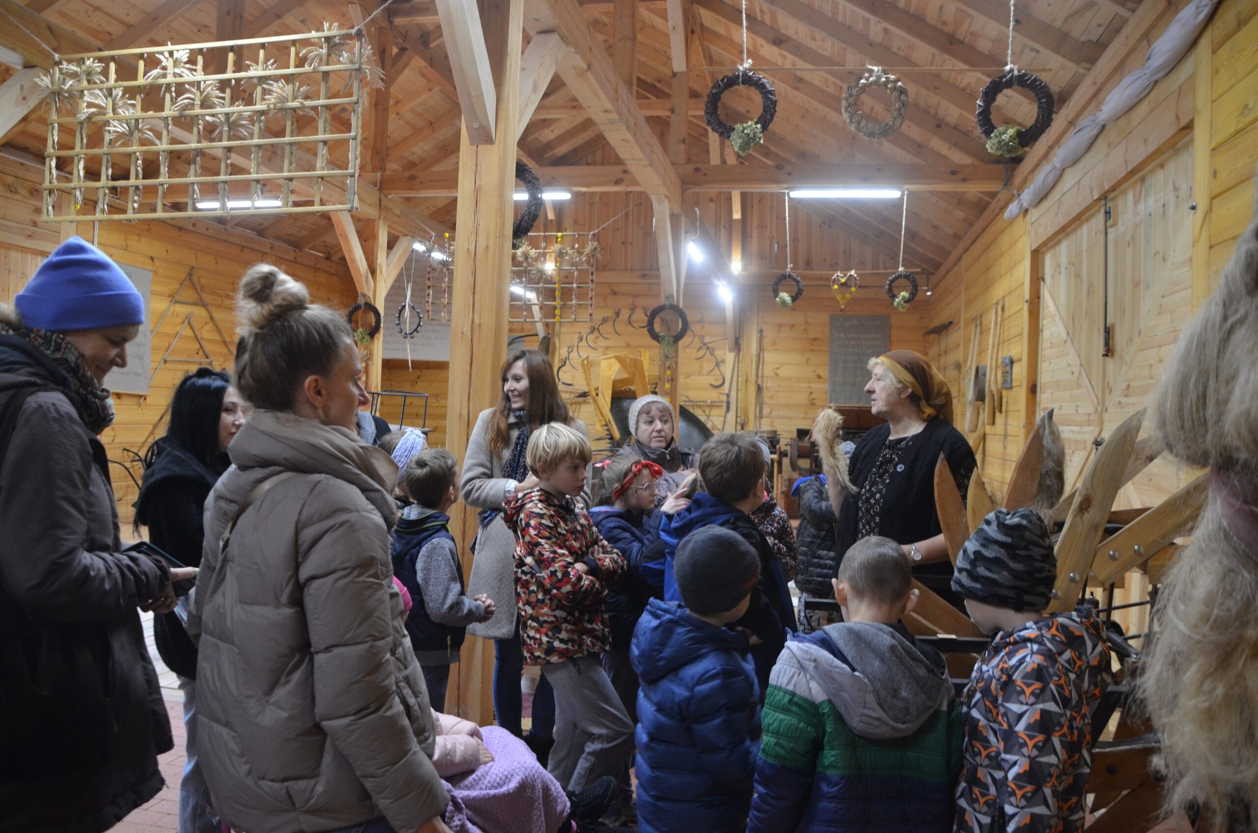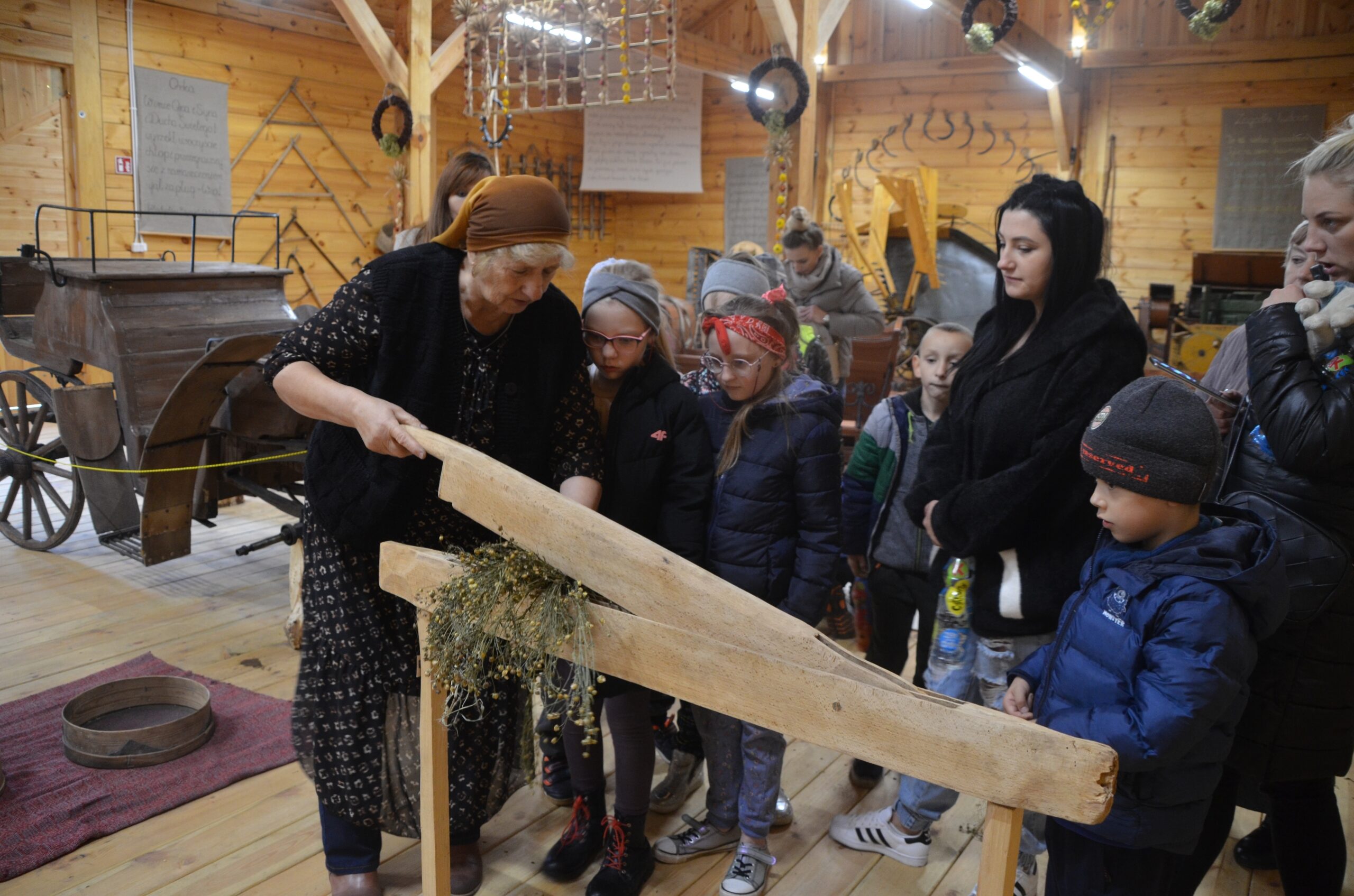 Po degustacji nadszedł czas na odwiedziny pomieszczeń nowego kompleksu Centrum Kultury Dawnej, w tym kuźni i stodoły, które stanęły niedawno obok Izby. Szczególnie wystrój i wyposażenie stodoły przykuły uwagę zwiedzających, gdzie zgromadzono najwięcej eksponatów wielkogabarytowych, jak np. wóz drabiniasty, sanie, dorożkę czy wialnię. W stodole odbył się także pokaz obróbki lnu, przeprowadzony przez Opiekunkę obiektów, Wandę Szpugę. Uczniowie mogli zobaczyć jak wygląda len na najważniejszych etapach jego obróbki oraz jak używano niegdyś takich sprzętów jak międlica, trzepak do lnu, czy kołowrotek.
