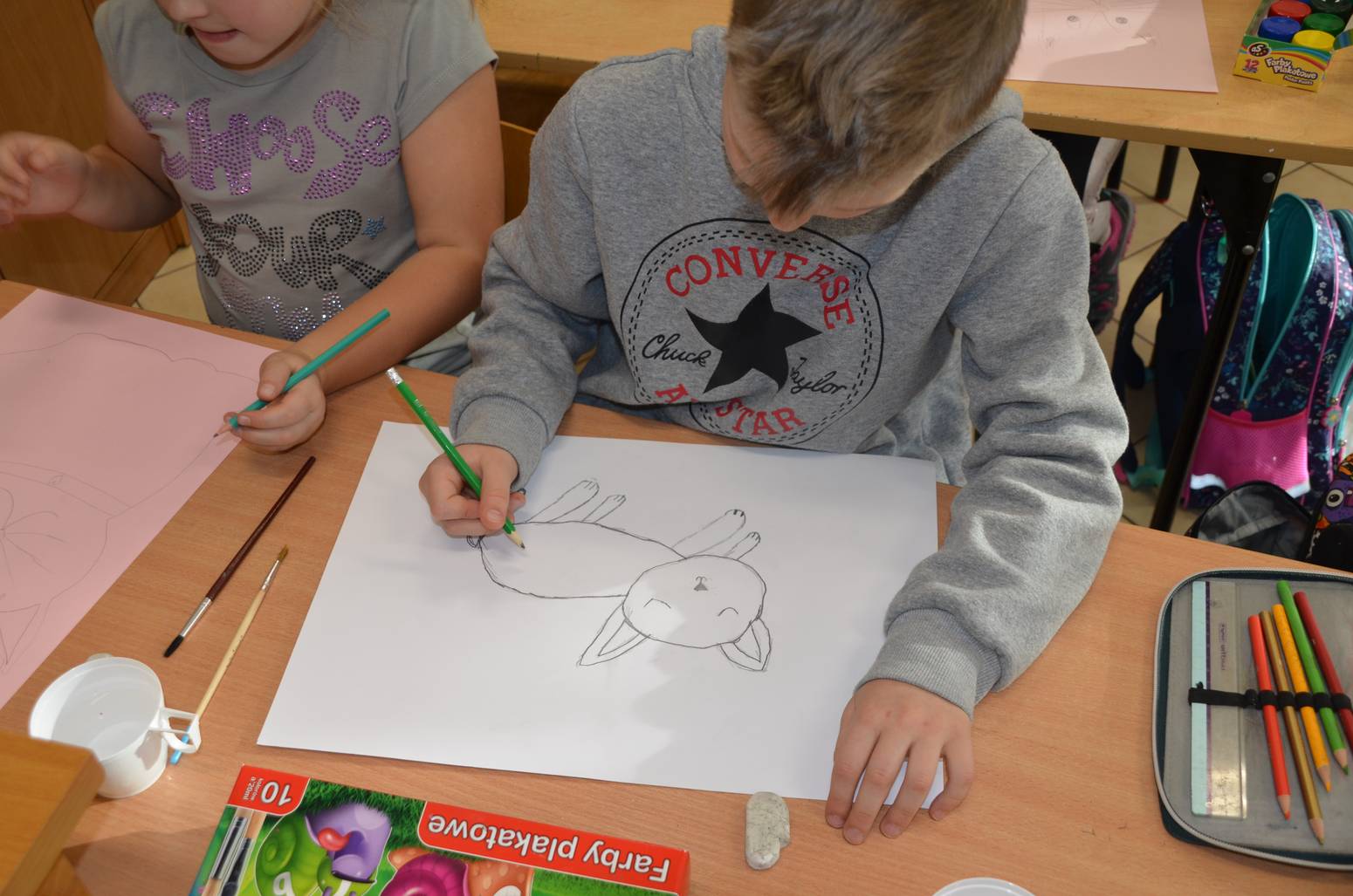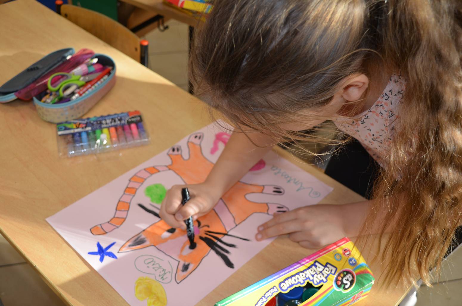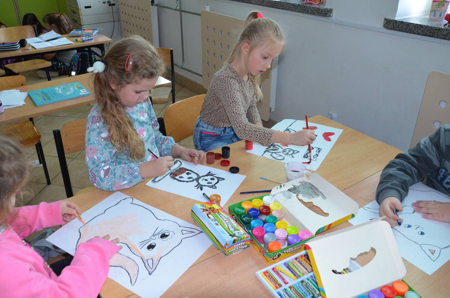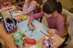Tym razem tematem cyklicznych zajęć kreatywnych dla dzieci pod czujnym okiem animatorki Ewy Miąsik z Gminnego Ośrodka Kultury Gminy Zamość w Wysokiem było kolorowanie postaci kotka za pomocą farb.