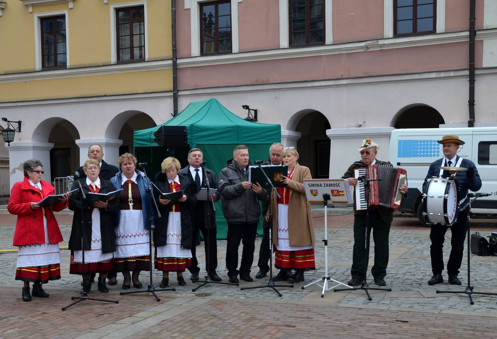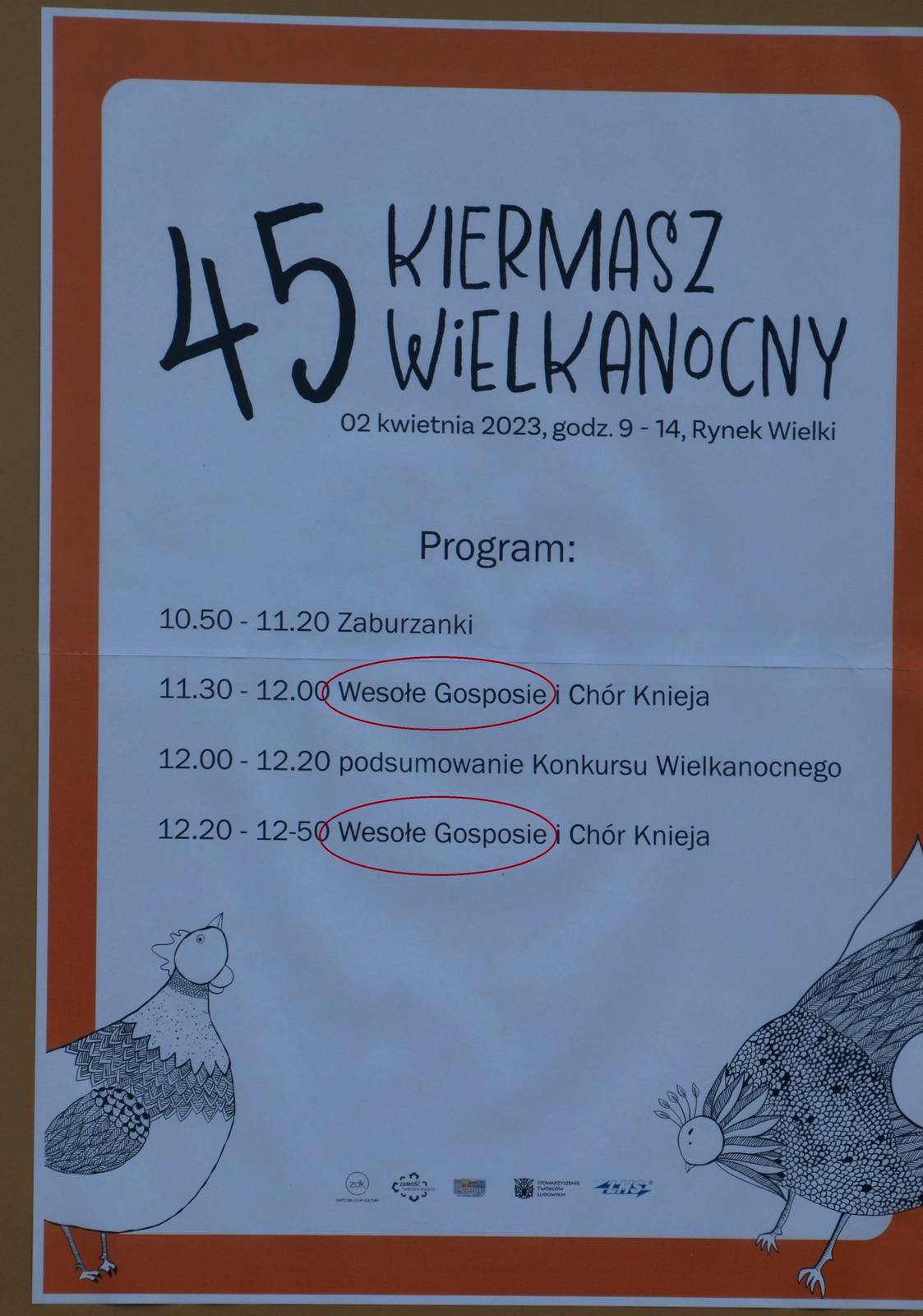 Zespoły „Wesołe Gosposie” i „Knieja” zaśpiewały razem na Kiermaszu Wielkanocnym w Zamościu. W zimną i pochmurną niedzielę, 2 kwietnia 2023 r., na zamojskim Rynku Wielkim odbył się doroczny kiermasz, połączony z podsumowaniem wielkanocnych konkursów rękodzieła, jakie wcześniej zrealizował Zamojski Dom Kultury. Kiepska pogoda była bodajże głównym powodem, że tegoroczny kiermasz miał dosyć skromną formę, największym stoiskiem mogła pochwalić się Gmina Zamość. Zespół Ludowo-Obrzędowy „Wesołe Gosposie” z Sitańca Kolonii, funkcjonujący pod skrzydłami Gminnego Ośrodka Kultury Gminy Zamość, zaprezentował wspólny program wokalno-muzyczny z zaprzyjaźnionym męskim Chórem Myśliwskim „Knieja”, działającym przy Zarządzie Okręgowym Polskiego Związku Łowieckiego w Zamościu. Ten swoisty duet zespołów miał dwie odsłony z przerwą na rozstrzygnięcie Konkursu Wielkanocnego ZDK.