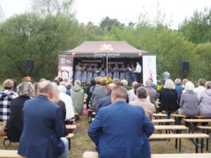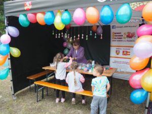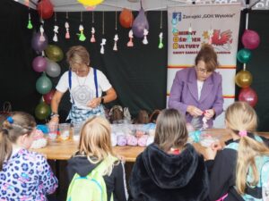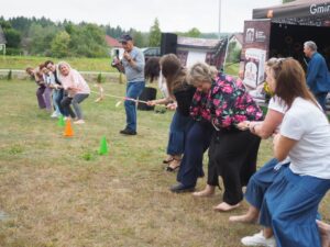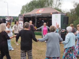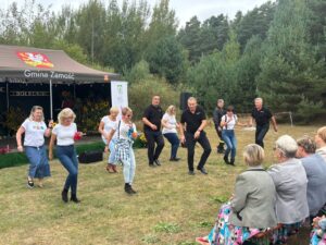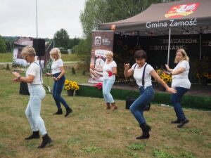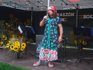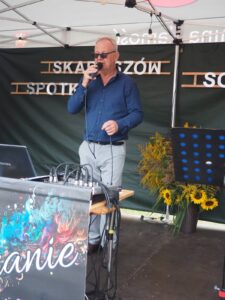 Od samego początku najmłodsi uczestnicy wydarzenia mogli korzystać z oferty warsztatów plastycznych, przygotowanych przez 3 animatorki Zamojskiego „GOK-u Wysokie”. Dzieci miały okazję własnoręcznie wykonać kolorowe breloki z zimnej porcelany, ozdabiając je barwnymi koralikami. Warsztaty cieszyły się ogromnym zainteresowaniem i były doskonałą okazją do rozwijania kreatywności oraz spędzenia czasu w twórczej atmosferze. Tymczasem część artystyczna rozpoczęła się występem miejscowego zespołu śpiewaczego „Kalinka” z instruktorem Danielem Narolskim. Grupa zaprezentował żywiołowy i rozrywkowy repertuar wokalny. Lokalna publiczność z entuzjazmem przyjęła swoich reprezentantów, którzy rozgrzali scenę już na samym początku. Następnie zaprezentowała się taneczna grupa fitness „Folkowe Gwiazdeczki” prowadzona przez Agnieszkę Tor. Tancerki zachwyciły publiczność energią, kolorowymi strojami i żywiołową choreografią. Kolejnym punktem programu był występ męskiego zespołu wokalnego „ShowMen Szopinek” z instruktorem Cezarym Gomułką. Ich dynamiczny show porwał do tańca niemal całe sołeckie spotkanie – uczestnicy wydarzenia nie pozostali obojętni na dźwięki i rytmy, dołączając do wspólnej zabawy. Publiczność miała również okazję zobaczyć w akcji drugi męski zespół wokalny pn. „Chyżanie” z instruktorem Ireneuszem Szewczukiem, który wystąpił również solo. Zespół zaprezentował repertuar pełen energii i humoru, który idealnie wpisał się w charakter wydarzenia. Na zakończenie scenę opanował mono-kabaret Dariusza Tłuczkiewicza z Białobrzeg, który ponownie wcielił się w uwielbianą przez lokalną społeczność postać „Cioci Heli”. Jego kabaretowy występ rozbawił publiczność do łez i był idealnym zwieńczeniem pełnego emocji dnia. „Spotkanie Sołeckie na Wesoło” pokazało, jak wielki potencjał drzemie w lokalnych społecznościach. Dzięki zaangażowaniu organizatorów, tj. Samorządu Gminy Zamość, Sołtyski i Rady Sołeckiej Sołectwa Skaraszów, Koła Gospodyń Wiejskich w Skaraszowie, Klubu Seniora „Kalinka” i przy wsparciu Gminnego Ośrodka Kultury Gminy Zamość, Ochotniczej Straży Pożarnej w Mokrem, Gminnego Zakładu Obsługi Komunalnej i samych uczestników wydarzenia, Skaraszów na jeden dzień zamienił się w tętniące życiem centrum kultury, integracji i dobrej zabawy.