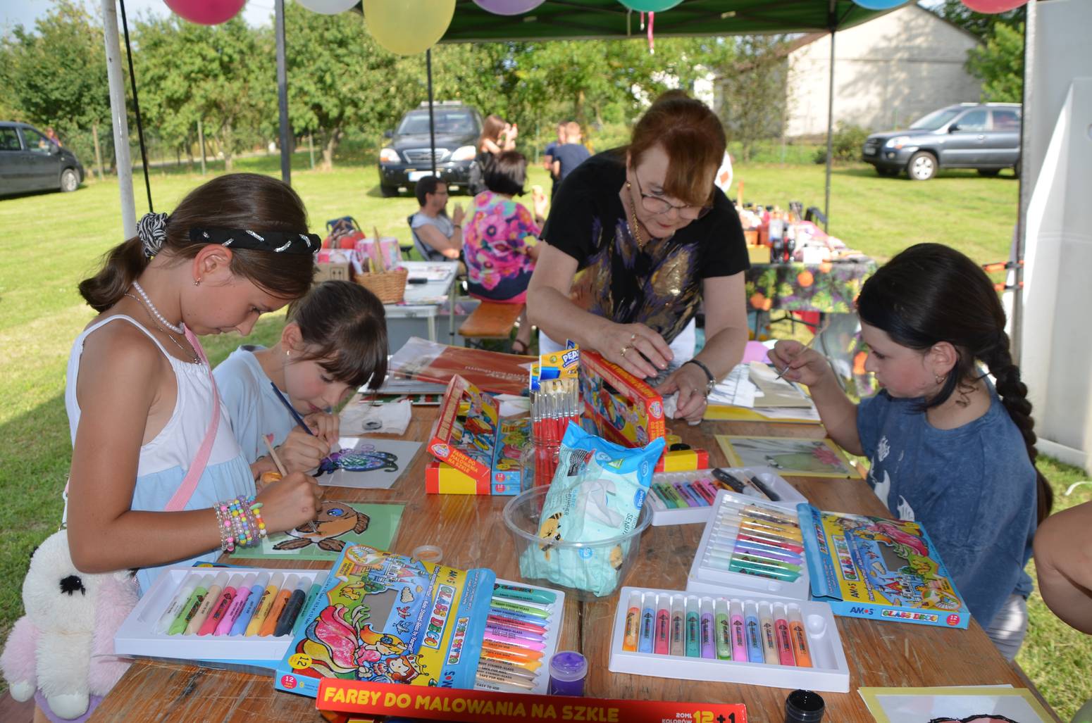 Animatorka Ewa z Zamojskiego „GOK-u Wysokie” poprowadziła warsztaty manualno-artystyczne, pt. „Malowanie na szkle”. Najmłodsi uczestnicy festynu i bywalcy naszego stoiska mogli najpierw wybrać szablon obrazka, a następnie przy pomocy specjalnych farb witrażowych stworzyć własne dzieło sztuki na szkle. Tym samym, podczas festynu powstały kolorowe motylki, żabki, kwiaty i owoce, a każdy z uczestników zabrał swój „szklany” obrazek do domu. W trakcie festynu swój jubileusz 20-lecia obchodziło miejscowe Koło Gospodyń Wiejskich w Białobrzegach. Specjalnie dla Pań z białobrzeskiego KGW zaśpiewali Panowie z męskiego zespołu „Chyżanie”. Były także m.in. występy dzieci z Bortatycz i Białobrzeg i prelekcja, pt. „Co słyszymy w lesie”. Organizatorami wydarzenia byli Samorząd Gminy Zamość, Sołtys i Rada Sołecka Białobrzeg oraz Koło Gospodyń Wiejskich w Białobrzegach.
