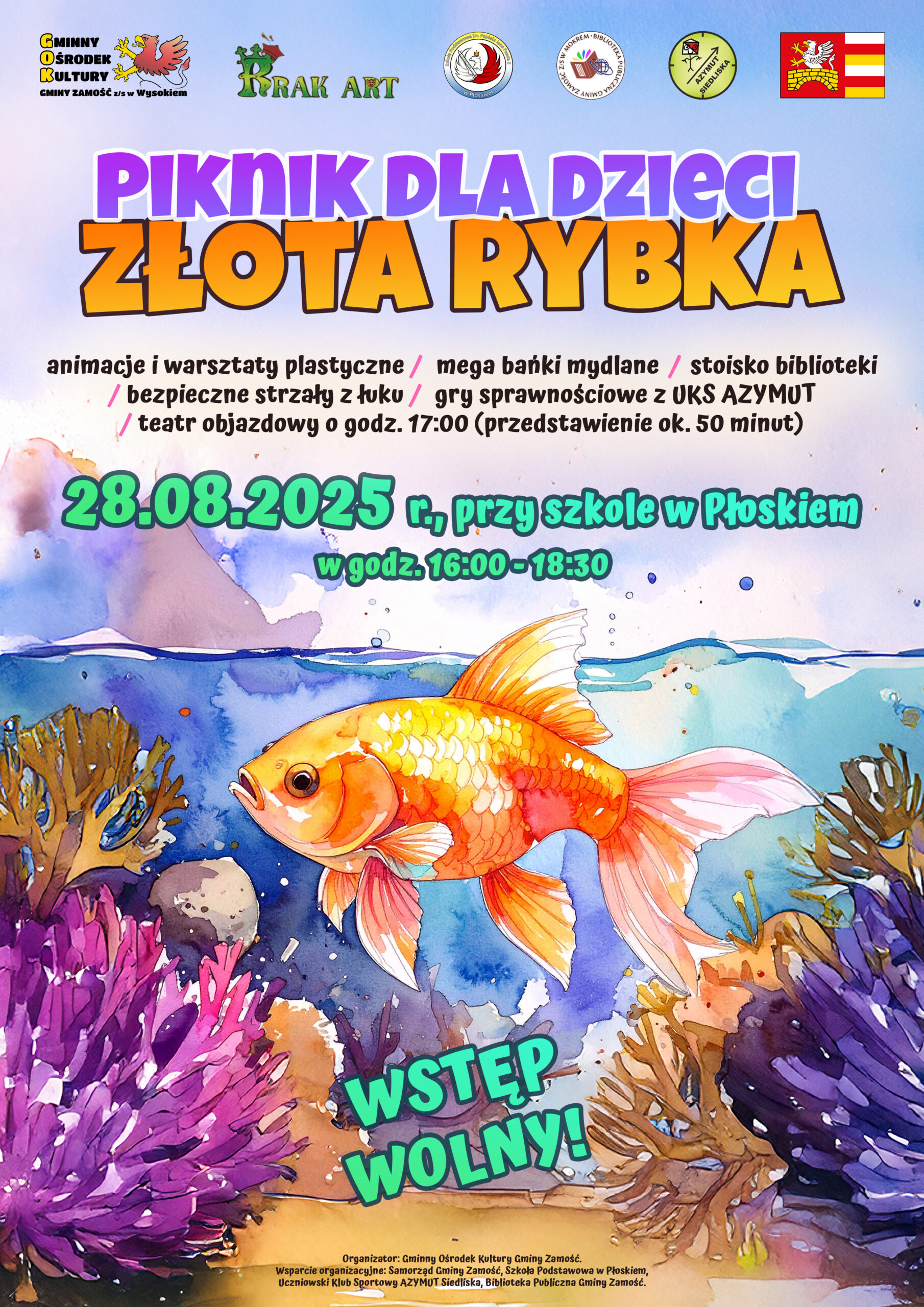 W czwartek, 28.08.2025 r., w Płoskiem odbędzie się otwarte przedstawienie teatralne dla dzieci, pt. „Złota rybka”, krakowskiego Teatru KRAK-ART. Spektakl będzie główną atrakcją pikniku dla dzieci, przełożonego z piątku (22.08.2025 r.) z powodu złych prognoz pogodowych. Organizatorem wiodącym pikniku jest Gminny Ośrodek Kultury Gminy Zamość. To będzie swoisty finał cyklu wakacyjnych zajęć w naszej Gminie. Piknik odbędzie się na terenach zielonych przy Szkole Podstawowej w Płoskiem. Start o godz. 16:00. Wstęp wolny! Zapraszamy dzieci z dorosłymi opiekunami.