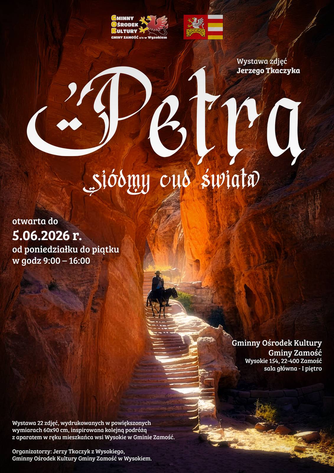 To wszystko zobaczył na żywo mieszkaniec Gminy Zamość, Jerzy Tkaczyk, z podzamojskiej wsi Wysokie. Podróżnik odwiedził Jordanię niedawno, zrobił setki zdjęć, z których wybrał zaledwie 22 na potrzeby foto-wystawy w siedzibie Zamojskiego „GOK-u Wysokie”. Po raz pierwszy Pan Jurek zrealizował pomysł, aby wybrane zdjęcia wydrukować w bardzo dużym rozmiarze 90×60 cm, aby widzowie mogli dostrzec szczegóły architektoniczne i wyjątkową aurę antyku, jaka wciąż panuje w Petrze i niektórych rejonach Jordanii.