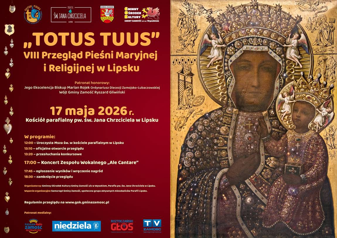 VIII Przegląd TOTUS TUUS Pieśni Maryjnej i Religijnej odbędzie się 17.05.2026 r. w kościele parafialnym pw. św. Jana Chrzciciela w Lipsku /Gmina Zamość/ w godzinach 12:00-18:30 (przesłuchania konkursowe od godz. 13:15). W konkursie będzie można wysłuchać wielu pieśni sakralnych w aranżacjach artystów z Gminy Zamość i okolic. Patronat honorowy nad wydarzeniem objęli Jego Ekscelencja Biskup Marian Rojek – Ordynariusz Diecezji Zamojsko-Lubaczowskiej oraz Wójt Ryszard Gliwiński.